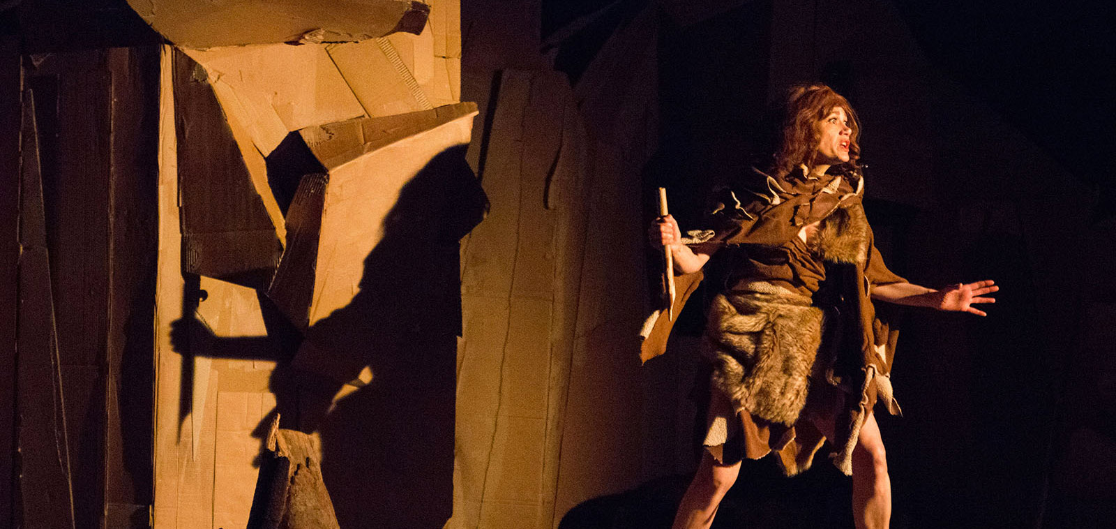 Pascale Vignal interprète La Grande, mais aussi tous les autres personnages du roman. Ensemble, nous avons imaginé une grotte préhistorique bien à nous, plus actualisée que jamais : en carton ! J'ai construit la totalité du décor (ignifugé) et conçu les costumes, parrures et accessoires de la Grande. Le spectacle tourne dans de nombreux festivals et événements en lien avec la préhistoire.